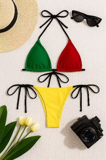 Fabric: 80% Nylon, 20% Polyester — Smooth, durable swim fabric. Fully lined.Style: Chic three‑tone high‑waist set.Pattern Type: Bold geometric color‑block.